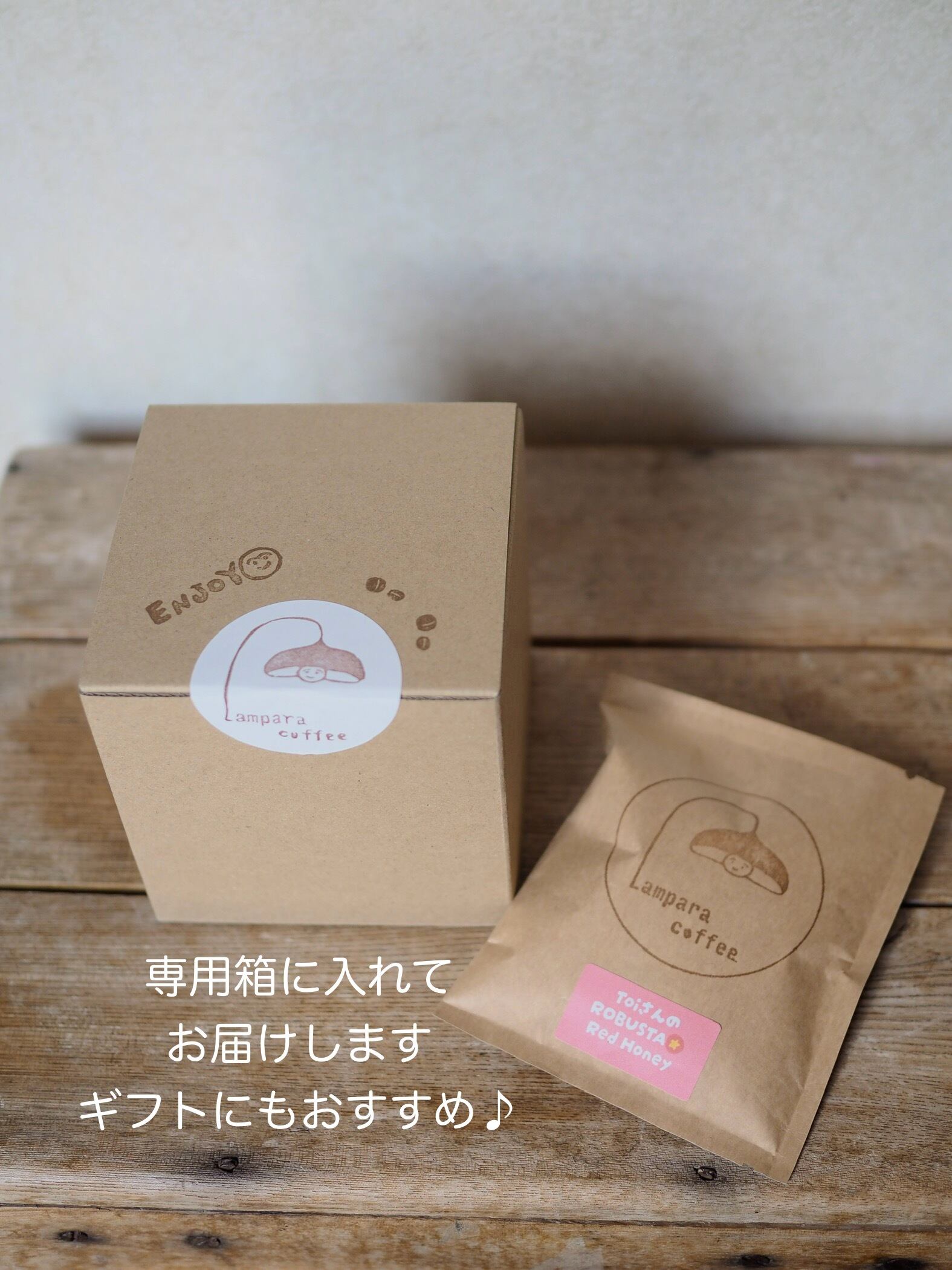 Lampara coffeeのロゴが刻印されたフィンと、お試し用Toiさんのロブスタコーヒー粉40gのセットです。